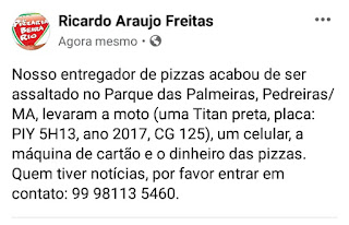 Um motoboy que presta seus serviços para a Pizzaria Beira Rio de Trizidela do Vale, sofreu um assalto na noite deste domingo (25/04) na região do Parque Palmeiras, em Pedreiras.