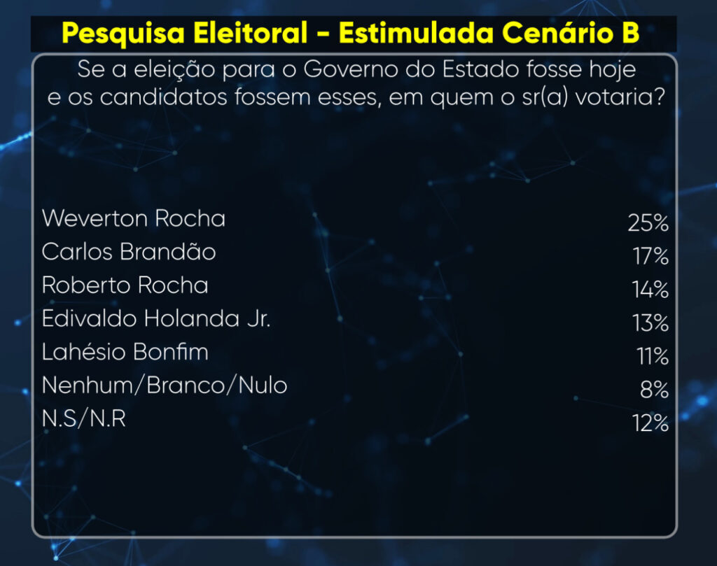 No cenário B Estimulado, Weverton Rocha aparece com 25%, seguido por Carlos Brandão com 17%, Roberto Rocha com 14%, Edivaldo Holanda Jr. com 13% e Lahésio Bonfim com 11%. 8% votariam em nenhum/branco/nulo e 12% não responderam.